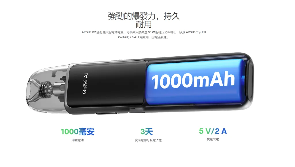 VOOPOO Argus G2 Pod Kit 是 ARGUS 系列的全面升級版,搭載最新 GENE.TT 晶片,提供更快啟動速度、更穩定輸出與更靈敏的吸阻感應,讓整體體驗大幅提升。內建 1000mAh 大容量電池 + 30W 最大輸出,續航力與性能表現雙雙升級,適合日常隨身使用與長時間外出。